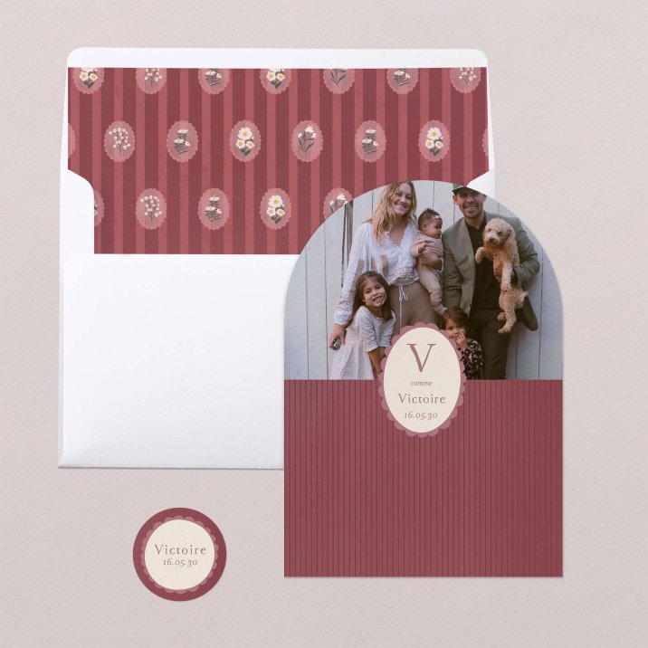 La douceur du velours s'invite sur le faire-part de naissance Burgundy velvet. Inspirée par la douceur de cet iconique textile, cette création bordeaux chic charmera vos proches, dès l'ouverture de l'enveloppe.