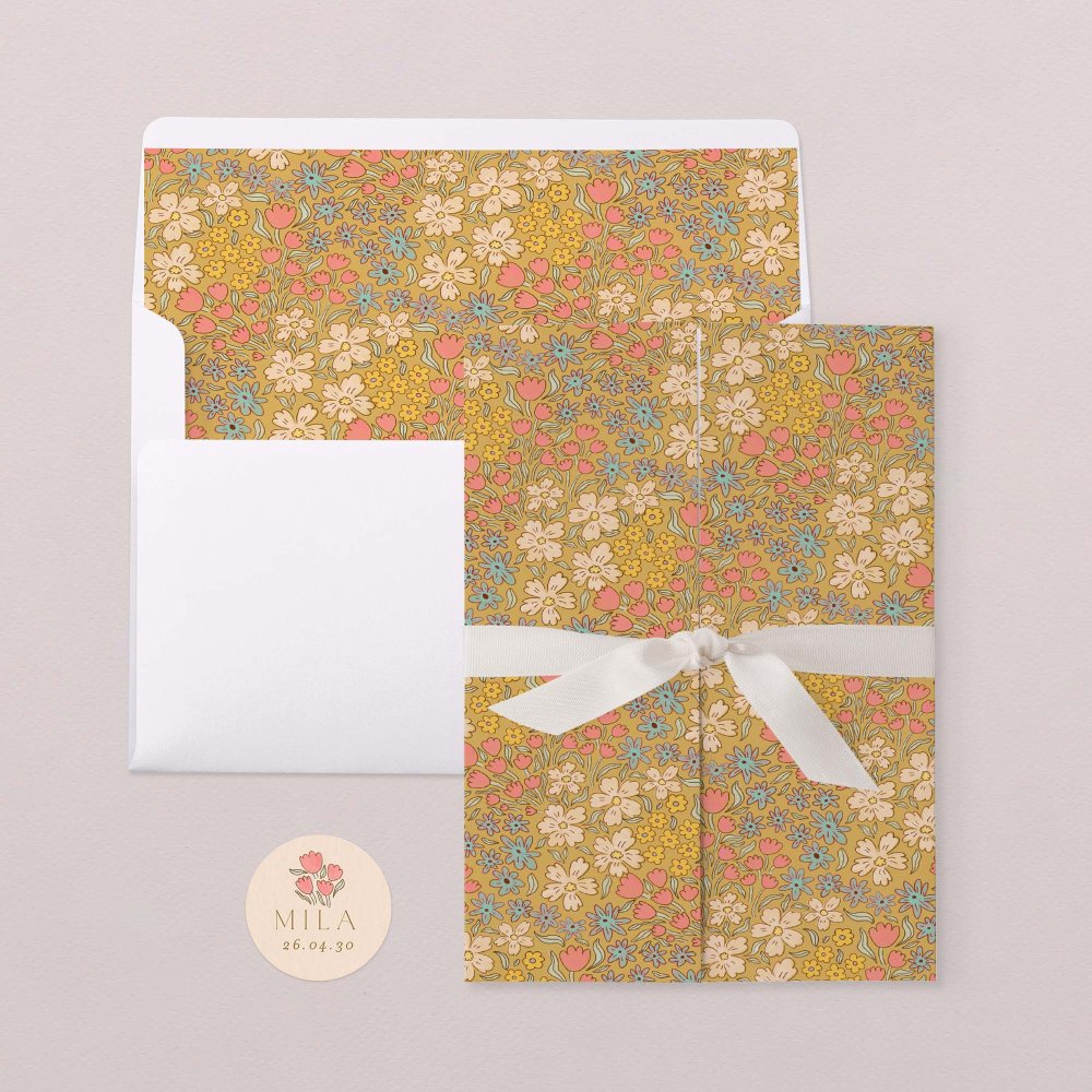 Le faire-part de naissance Inaya révèle un superbe tableau de fleurs aux couleurs ensoleillées. Au centre de cette joyeuse fresque aux palettes jaunes et orangés, le prénom de votre enfant est révélé. Une jolie façon de partager son arrivée, au printemps ou en plein cœur de l'été.