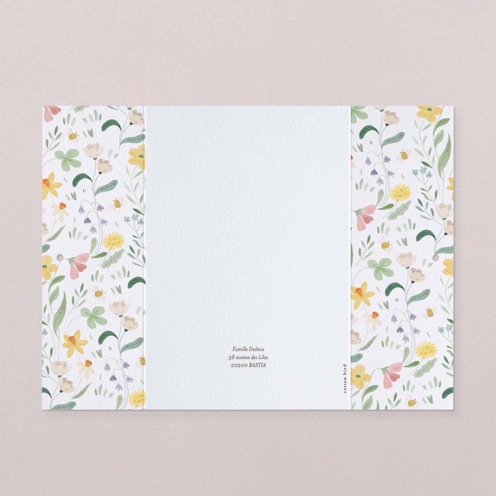 Jonquilles, violettes, pissenlits et autres fleurs colorées s'invitent sur le faire-part de naissance Lilly Rose. Frais et printanier, ce tableau complété d'adorables abeilles sera parfait pour conter l'arrivée de votre petite fille ou garçon, au printemps ou en été.