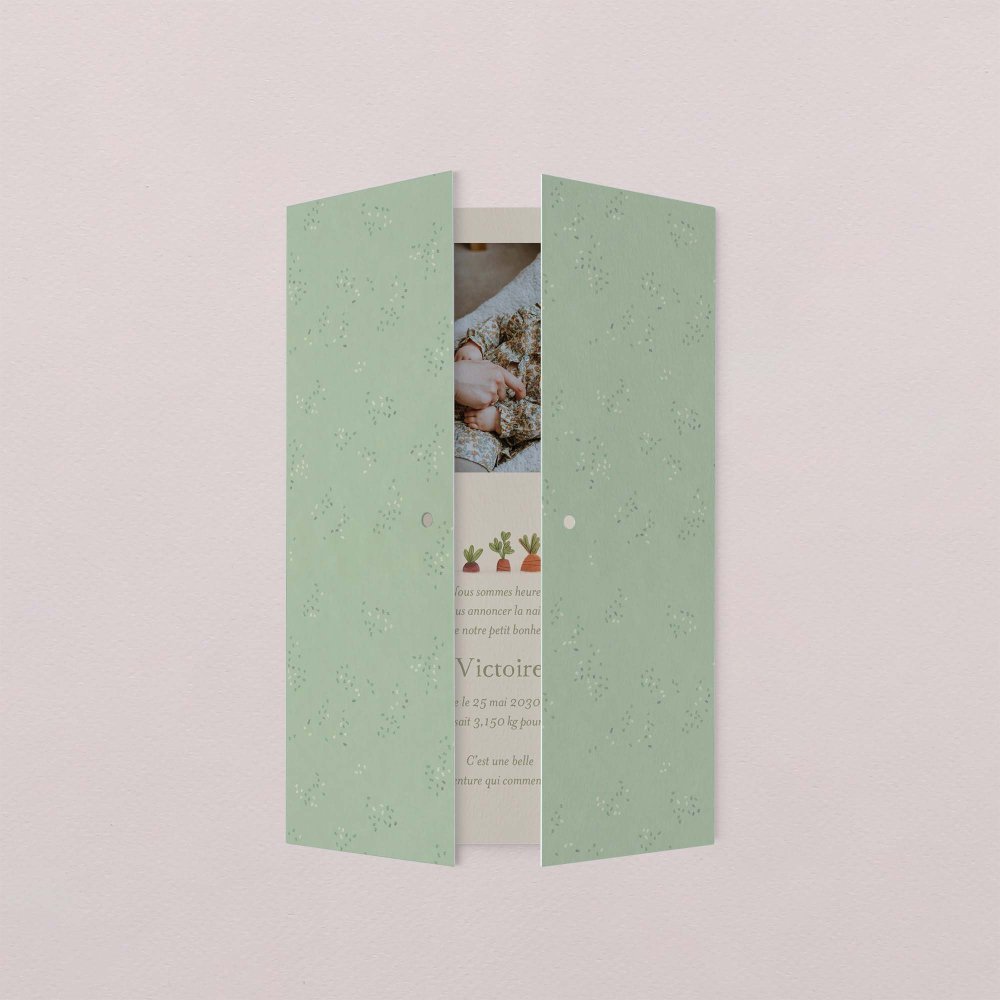 Ce faire-part se présente sous la forme d'une carte au format portrait, composée d'un volet central et de deux volets latéraux mobiles. À leur ouverture, ces derniers dévoilent les détails clés de la naissance de votre enfant. Ils peuvent être maintenus fermés grâce à un joli ruban (au choix et en supplément).