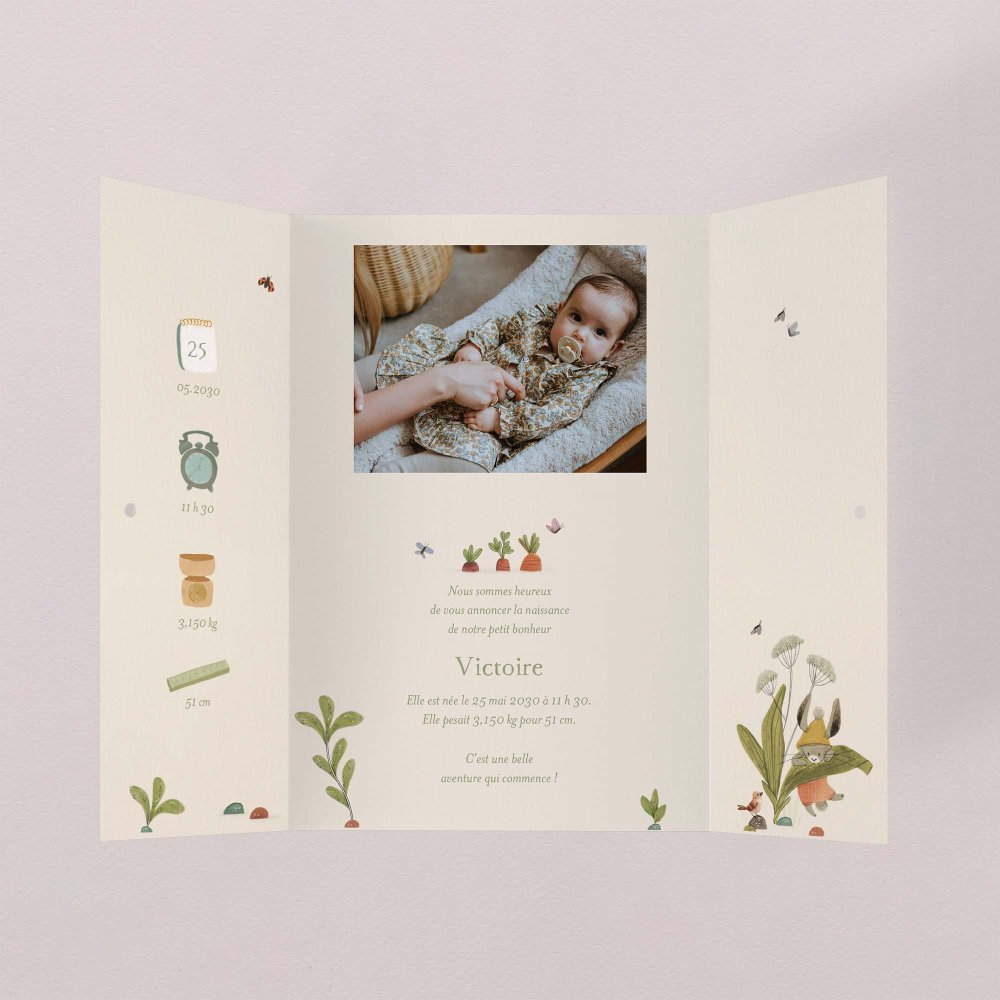 Célébrez la venue de votre nouveau-né dans un décor champêtre, empreint de tendresse et de douceur. Le faire-part de naissance Fleur de sureau est illustré d'un lapin s'amusant avec les animaux et les plantes, une manière ludique et unique d'annoncer l'heureuse nouvelle à vos proches.