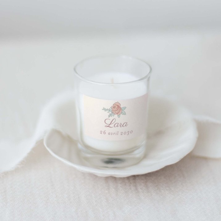 Fabriquée en France, la petite bougie est délivrée avec son étiquette adhésive personnalisée, à coller par vos soins.