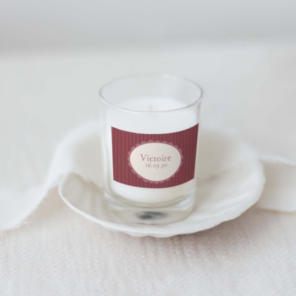 Fabriquée en France, la petite bougie est délivrée avec son étiquette adhésive personnalisée, à coller par vos soins.