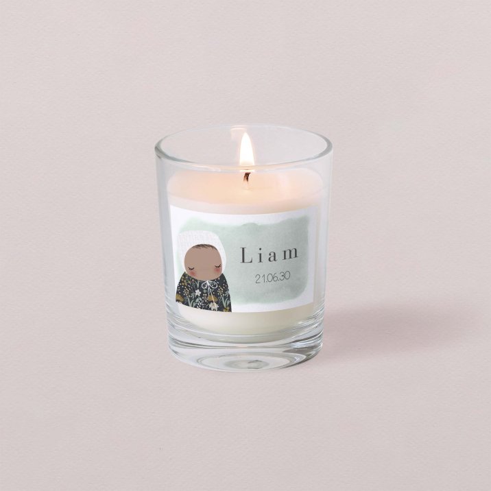 La petite bougie parfumée est à offrir en guise de remerciements. Coulé dans un verre transparent, ce joli présent pourra être conservé longtemps, en souvenir de la naissance de votre enfant.