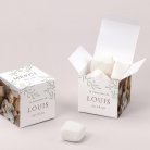 Pour enchanter vos proches, garnissez ce petit cube surprise de délicieuses dragées (disponibles en option), fabriquées artisanalement dans le sud de la France. Nous vous conseillons d’ajouter 20 dragées par boîte (50 g).