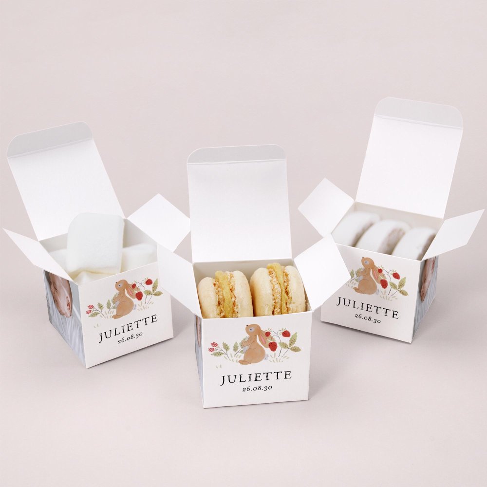 Pour enchanter vos proches, garnissez ce petit cube surprise de délicieuses dragées (disponibles en option), fabriquées artisanalement dans le sud de la France. Nous vous conseillons d’ajouter 20 dragées par boîte (50 g).
