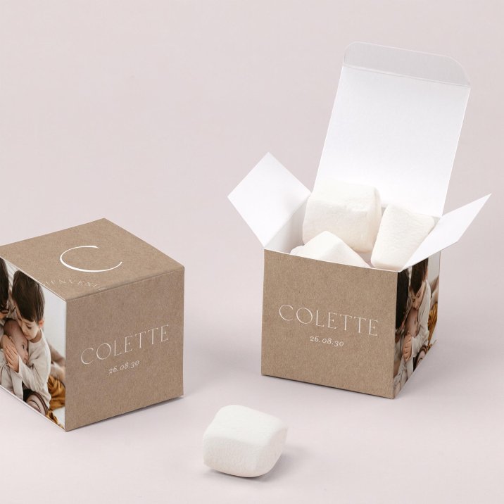 Pour enchanter vos proches, garnissez ce petit cube surprise de délicieuses dragées (disponibles en option), fabriquées artisanalement dans le sud de la France. Nous vous conseillons d’ajouter 20 dragées par boîte (50 g).