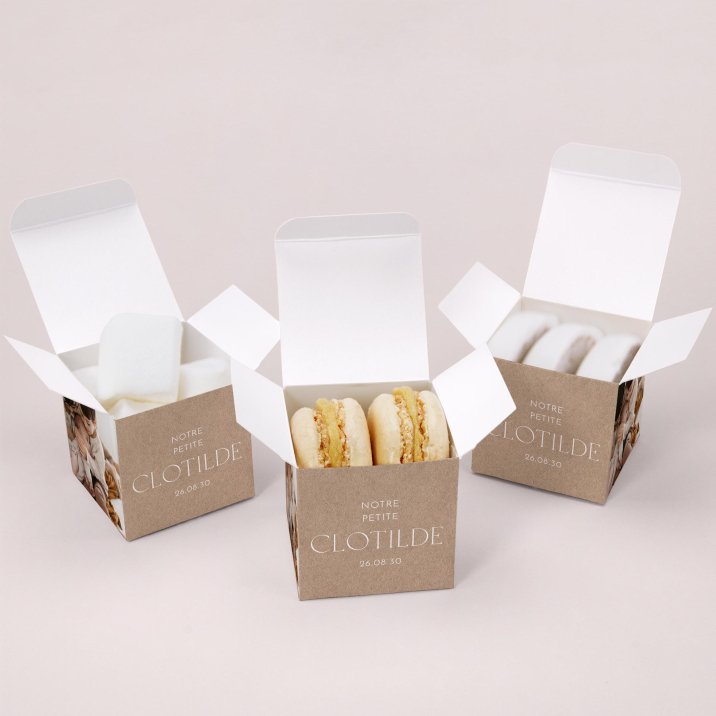 Pour enchanter vos proches, garnissez ce petit cube surprise de délicieuses dragées (disponibles en option), fabriquées artisanalement dans le sud de la France. Nous vous conseillons d’ajouter 20 dragées par boîte (50 g).