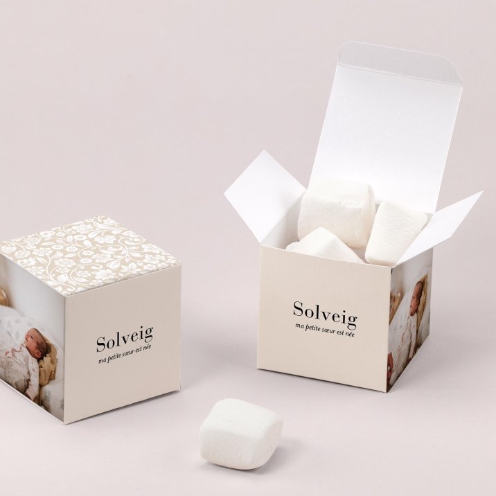 Pour enchanter vos proches, garnissez ce petit cube surprise de délicieuses dragées (disponibles en option), fabriquées artisanalement dans le sud de la France. Nous vous conseillons d’ajouter 20 dragées par boîte (50 g).