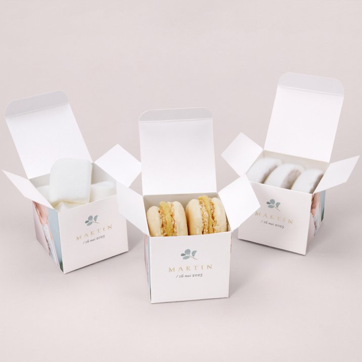 Pour enchanter vos proches, garnissez ce petit cube surprise de délicieuses dragées (disponibles en option), fabriquées artisanalement dans le sud de la France. Nous vous conseillons d’ajouter 20 dragées par boîte (50 g).