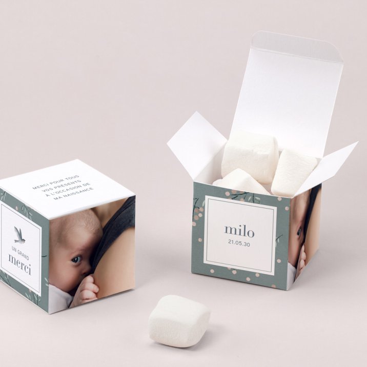 Pour enchanter vos proches, garnissez ce petit cube surprise de délicieuses dragées (disponibles en option), fabriquées artisanalement dans le sud de la France. Nous vous conseillons d’ajouter 20 dragées par boîte (50 g).