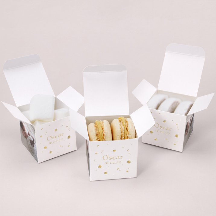 Pour enchanter vos proches, garnissez ce petit cube surprise de délicieuses dragées (disponibles en option), fabriquées artisanalement dans le sud de la France. Nous vous conseillons d’ajouter 20 dragées par boîte (50 g).