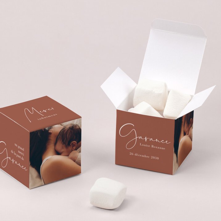 Pour enchanter vos proches, garnissez ce petit cube surprise de délicieuses dragées (disponibles en option), fabriquées artisanalement dans le sud de la France. Nous vous conseillons d’ajouter 20 dragées par boîte (50 g).