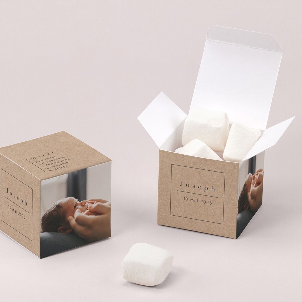 Pour enchanter vos proches, garnissez ce petit cube surprise de délicieuses dragées (disponibles en option), fabriquées artisanalement dans le sud de la France. Nous vous conseillons d’ajouter 20 dragées par boîte (50 g).