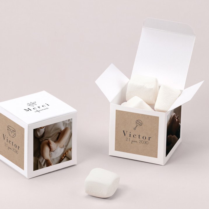 Pour enchanter vos proches, garnissez ce petit cube surprise de délicieuses dragées (disponibles en option), fabriquées artisanalement dans le sud de la France. Nous vous conseillons d’ajouter 20 dragées par boîte (50 g).
