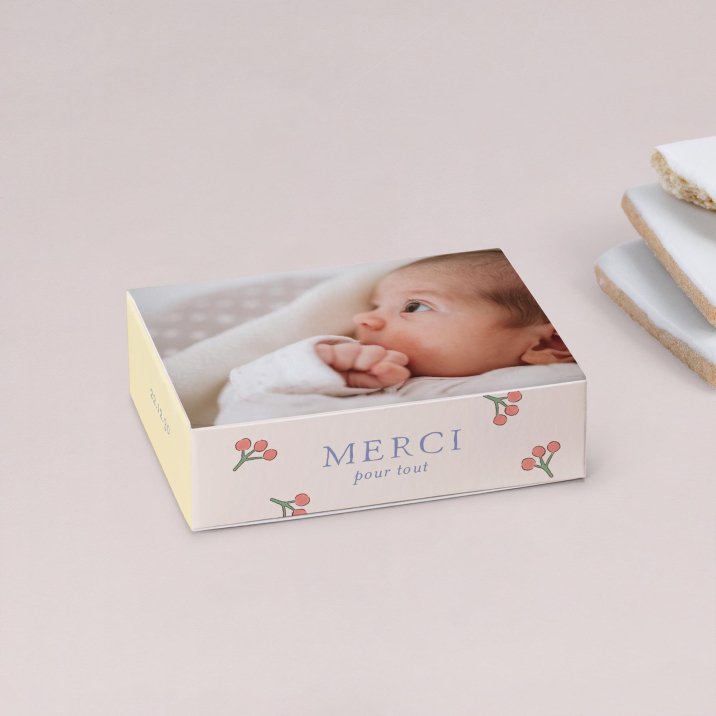 Remerciez vos proches pour leur présence et leurs cadeaux à la naissance de votre enfant, grâce à cette jolie boîte à biscuits personnalisée.