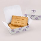 Boîte à biscuits livrée à plat, à monter soi-même. Biscuits disponibles en option (vendus par lot de 2 pour chaque boîte achetée). Durée de conservation des biscuits : 6 semaines.
