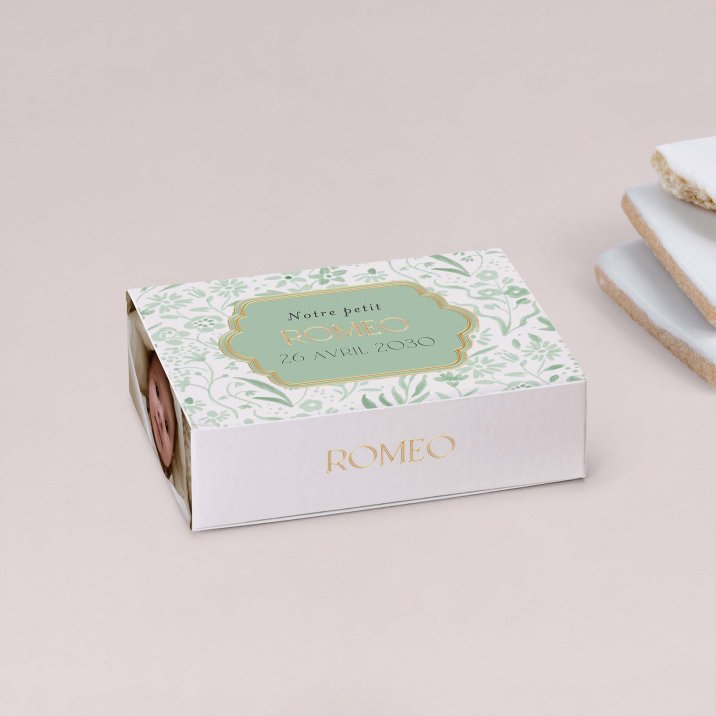 Remerciez vos proches pour leur présence et leurs cadeaux à la naissance de votre enfant, grâce à cette jolie boîte à biscuits personnalisée.