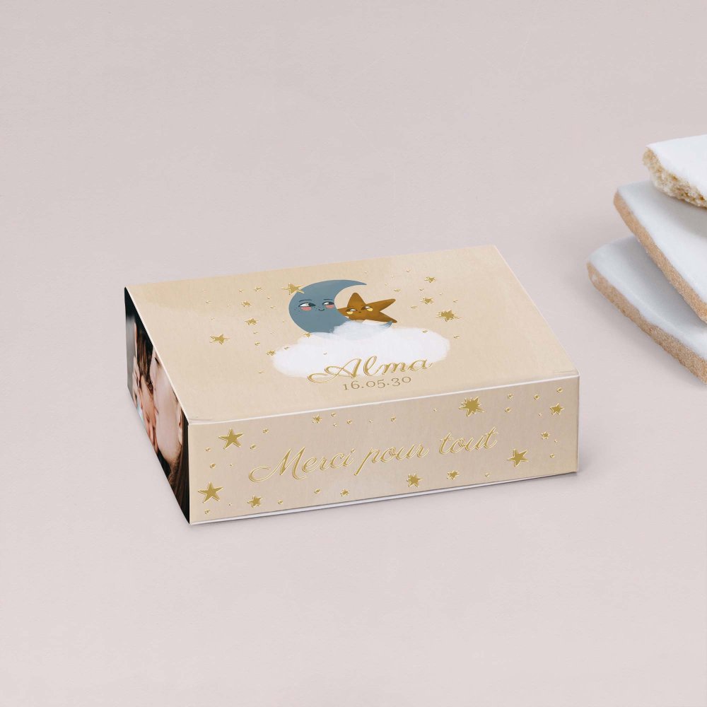 Remerciez vos proches pour leur présence et leurs cadeaux à la naissance de votre enfant, grâce à cette jolie boîte à biscuits personnalisée.