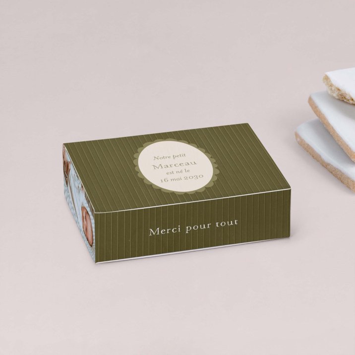 Remerciez vos proches pour leur présence et leurs cadeaux à la naissance de votre enfant, grâce à cette jolie boîte à biscuits personnalisée.
