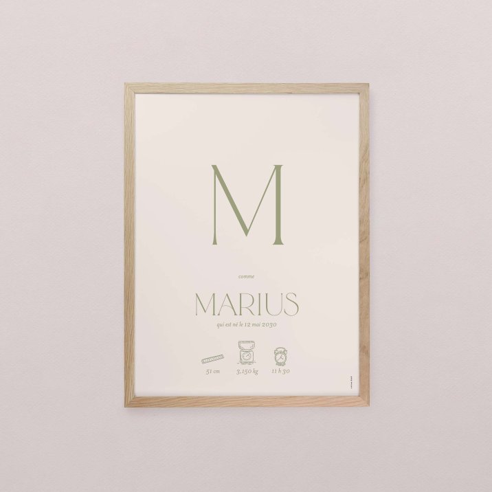 L'affiche se personnalise avec son prénom, sa taille, son poids, ainsi que l'heure et le jour de sa naissance.