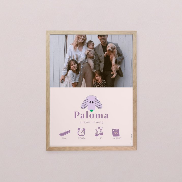 L'affiche se personnalise avec son prénom, sa taille, son poids, ainsi que l'heure et le jour de sa naissance.