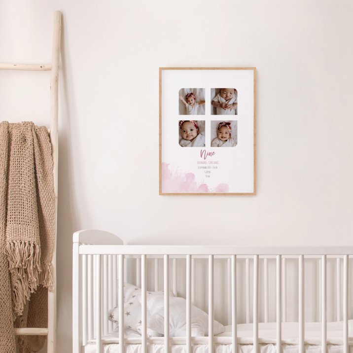 L'affiche Nine est la parfaite réplique du faire-part du même nom ! Cette jolie création viendra parfaitement décorer la chambre de bébé avec tous les détails de sa naissance.