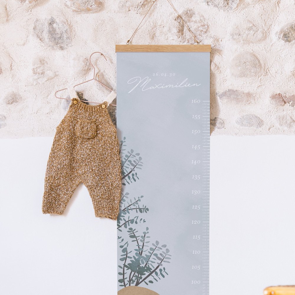 Suivez tendrement la croissance de votre enfant, année après année, avec cette toise illustrée. Graduée de 55 à 160 cm, cette toise se personnalise avec le prénom de votre enfant. Une jolie idée de cadeau à offrir ou à s’offrir, parfaite en décoration murale dans la chambre de votre petit dernier !