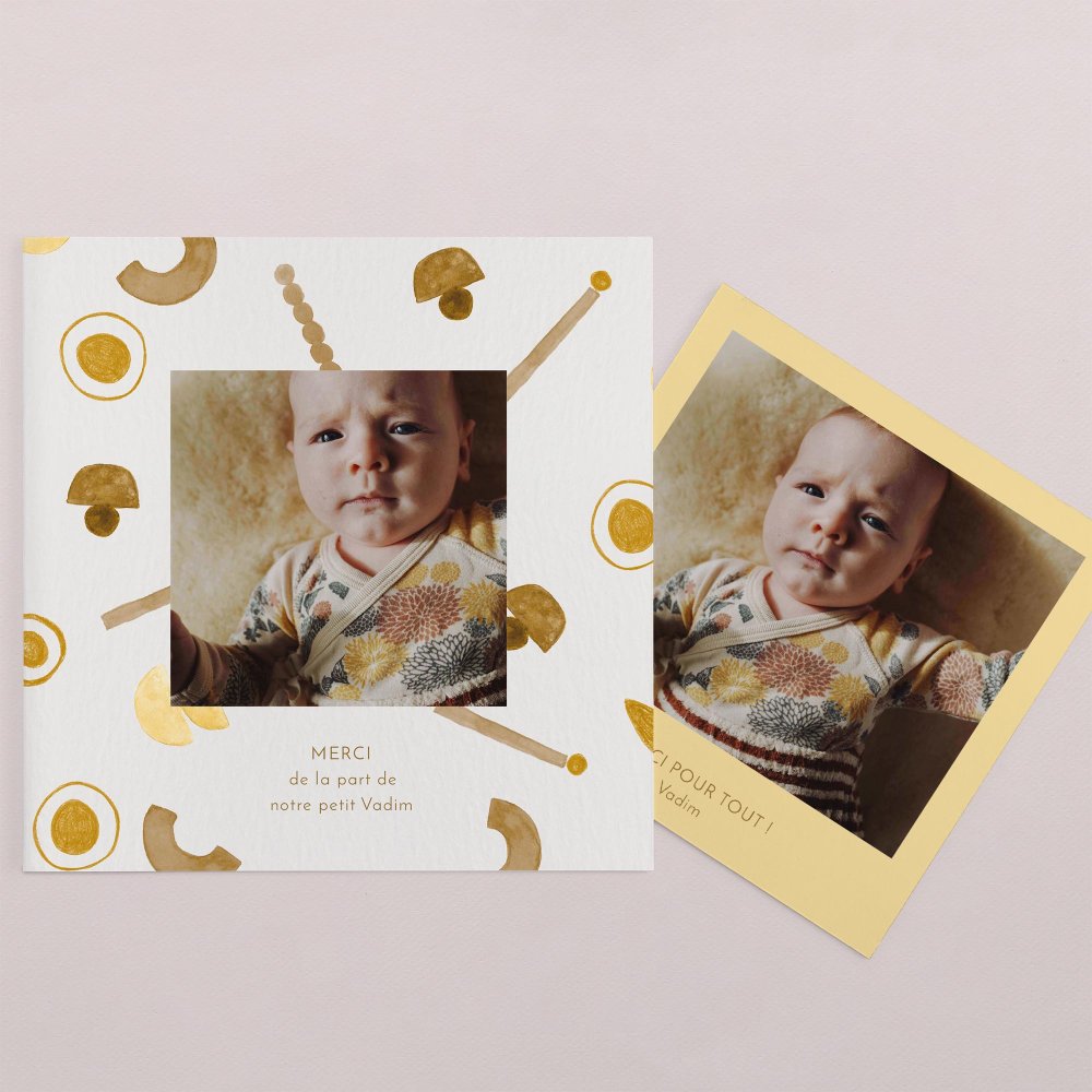 Cette carte de remerciements s'accompagne d'un cadeau glissé à l'intérieur : une photo de votre nouveau-né, inspirée du format polaroid (non magnétisé), qu'ils pourront conserver en souvenir, afficher selon leur inspiration, utiliser comme marque-page...