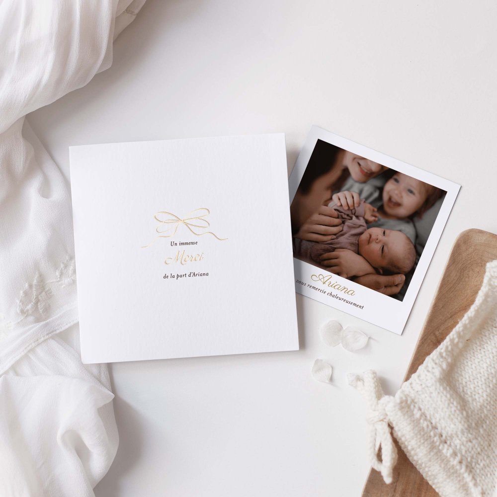 Cette carte de remerciements s'accompagne d'un cadeau glissé à l'intérieur : une photo de votre nouveau-né, inspirée du format polaroid (non magnétisé), qu'ils pourront conserver en souvenir, afficher selon leur inspiration, utiliser comme marque-page...