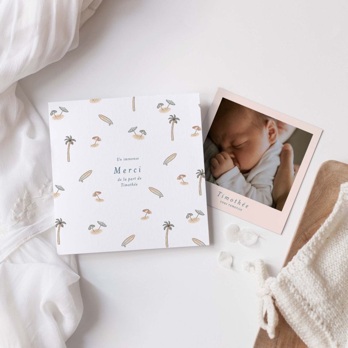 Remerciez les proches qui vous ont entouré et vous ont gâté d'attentions pour la naissance de bébé avec une jolie carte personnalisée. Cette carte de remerciements s'accompagne d'un cadeau glissé à l'intérieur : une photo de votre nouveau-né, inspirée du format polaroid (non magnétisé), qu'ils pourront conserver en souvenir, afficher selon leur inspiration, utiliser comme marque-page...