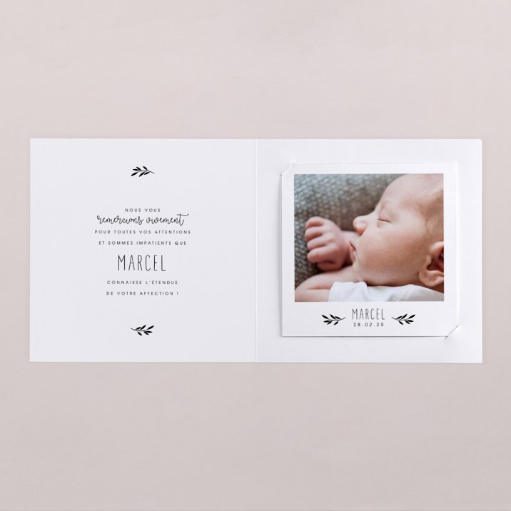 Cette carte de remerciements s'accompagne d'un cadeau glissé à l'intérieur : une photo de votre nouveau-né, inspirée du format polaroid (non magnétisé), qu'ils pourront conserver en souvenir, afficher selon leur inspiration, utiliser comme marque-page...