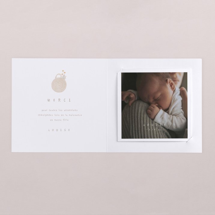 Cette carte de remerciements s'accompagne d'un cadeau glissé à l'intérieur : une photo de votre nouveau-né, inspirée du format polaroid (non magnétisé), qu'ils pourront conserver en souvenir, afficher selon leur inspiration, utiliser comme marque-page...