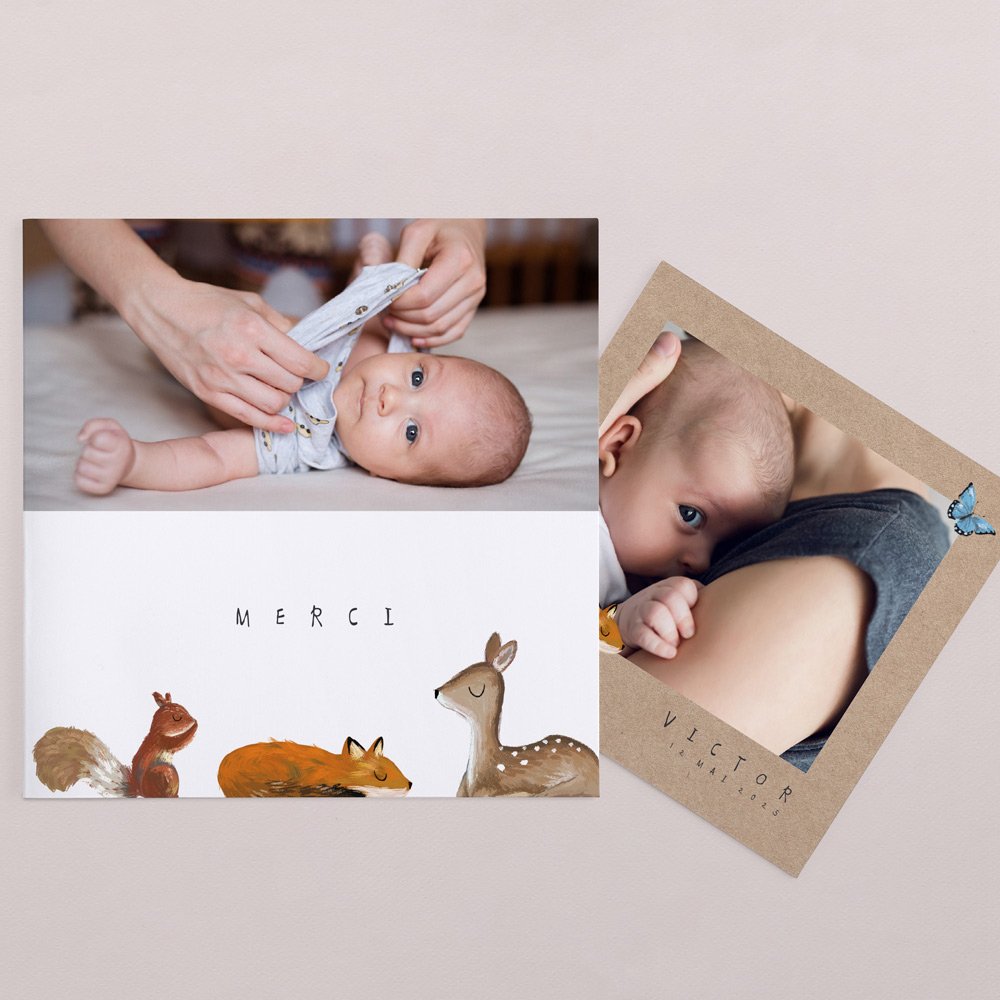 Cette carte de remerciements s'accompagne d'un cadeau glissé à l'intérieur : une photo de votre nouveau-né, inspirée du format polaroid (non magnétisé), qu'ils pourront conserver en souvenir, afficher selon leur inspiration, utiliser comme marque-page...