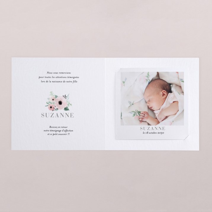 Cette carte de remerciements s'accompagne d'un cadeau glissé à l'intérieur : une photo de votre nouveau-né, inspirée du format polaroid (non magnétisé), qu'ils pourront conserver en souvenir, afficher selon leur inspiration, utiliser comme marque-page...