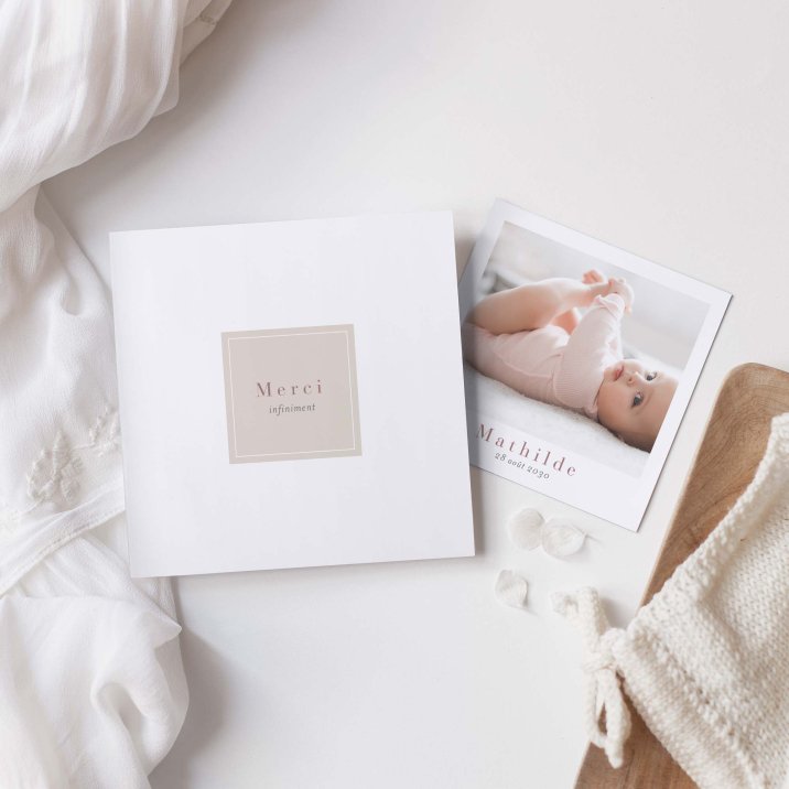 Remerciez les proches qui vous ont entouré et vous ont gâté d'attentions pour la naissance de bébé avec une jolie carte personnalisée. Cette carte de remerciements s'accompagne d'un cadeau glissé à l'intérieur : une photo de votre nouveau-né, inspirée du format polaroid (non magnétisé), qu'ils pourront conserver en souvenir, afficher selon leur inspiration, utiliser comme marque-page...