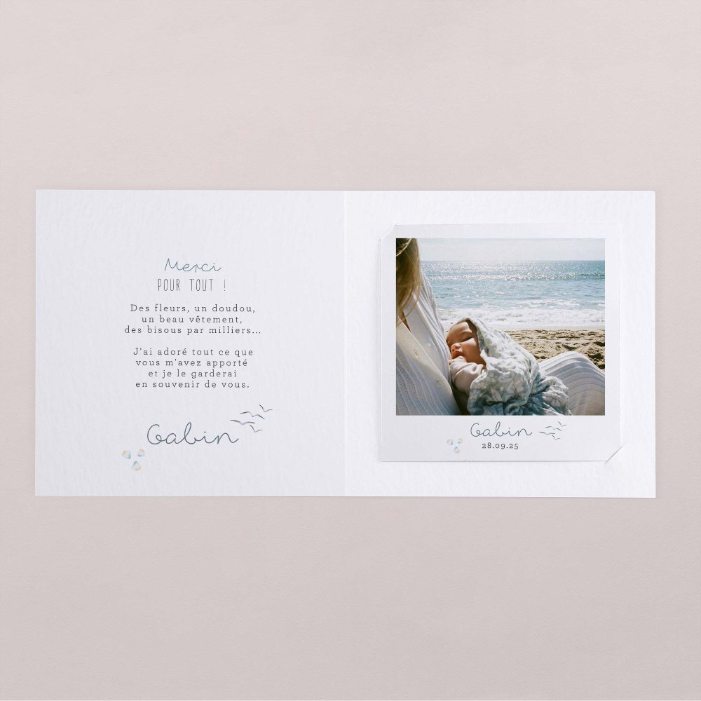 Cette carte de remerciements s'accompagne d'un cadeau glissé à l'intérieur : une photo de votre nouveau-né, inspirée du format polaroid (non magnétisé), qu'ils pourront conserver en souvenir, afficher selon leur inspiration, utiliser comme marque-page...