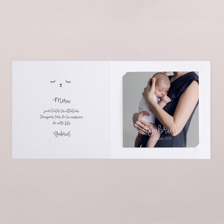 Cette carte de remerciements s'accompagne d'un cadeau glissé à l'intérieur : une photo de votre nouveau-né, inspirée du format polaroid (non magnétisé), qu'ils pourront conserver en souvenir, afficher selon leur inspiration, utiliser comme marque-page...