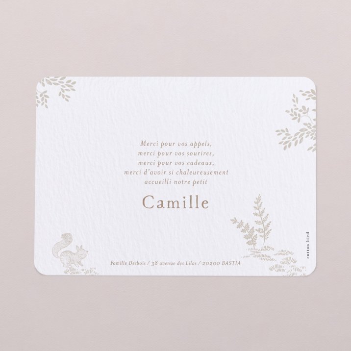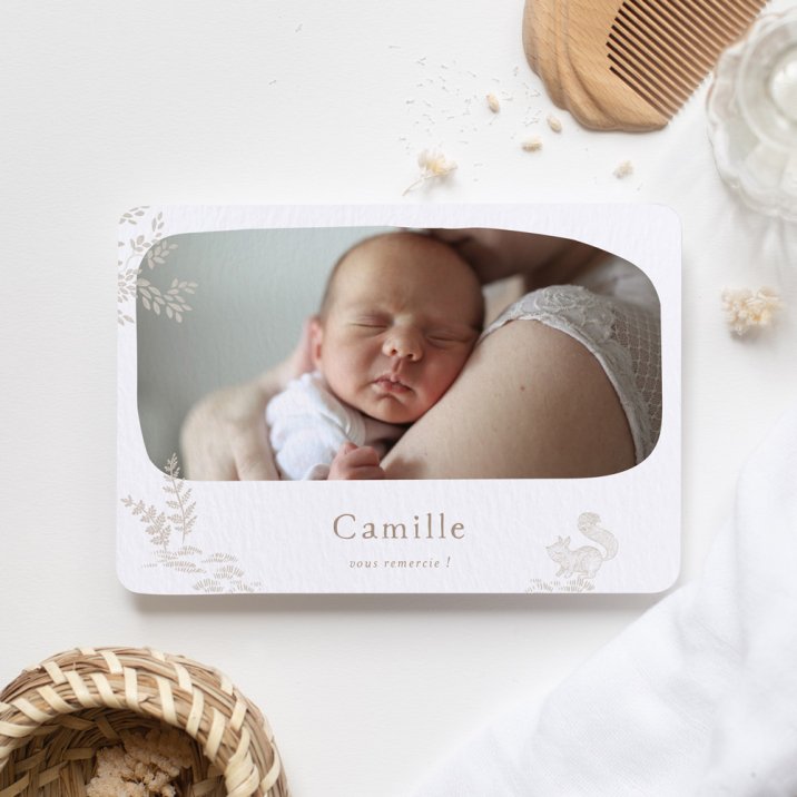 Carte de remerciements sobre, aux coins arrondis pour plus de douceur.