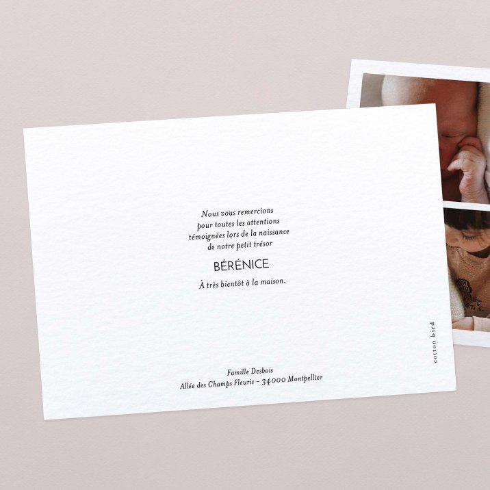Carte de remerciements simple en recto-verso, à personnaliser d'un côté avec votre photo et de l'autre avec votre texte.