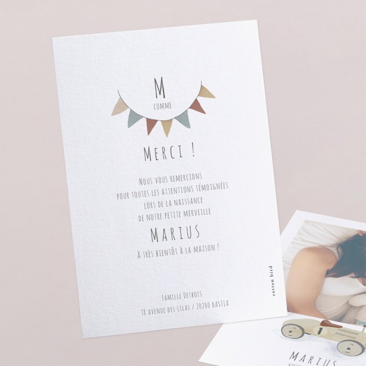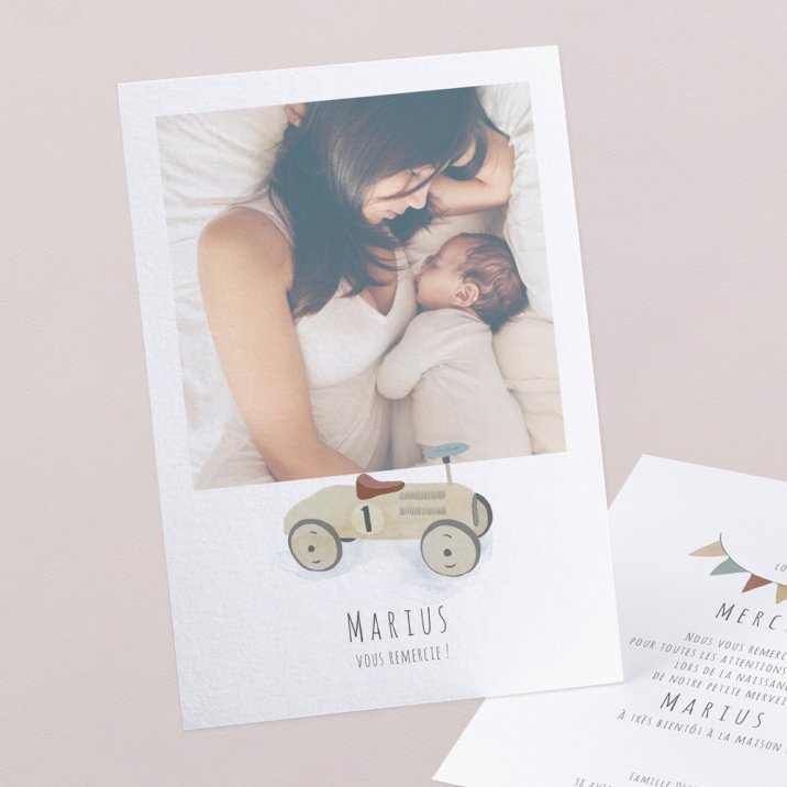 Carte de remerciements simple en recto-verso, à personnaliser d'un côté avec votre photo et de l'autre avec votre texte.