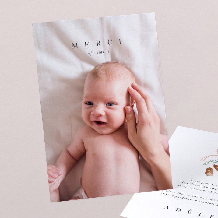 Carte de remerciements recto-verso, à personnaliser d'un côté avec votre photo et de l'autre avec votre texte.