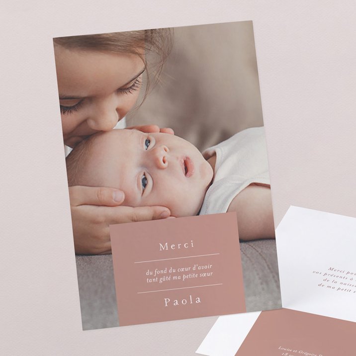 Carte de remerciements simple en recto-verso, à personnaliser d'un côté avec votre photo et de l'autre avec votre texte.