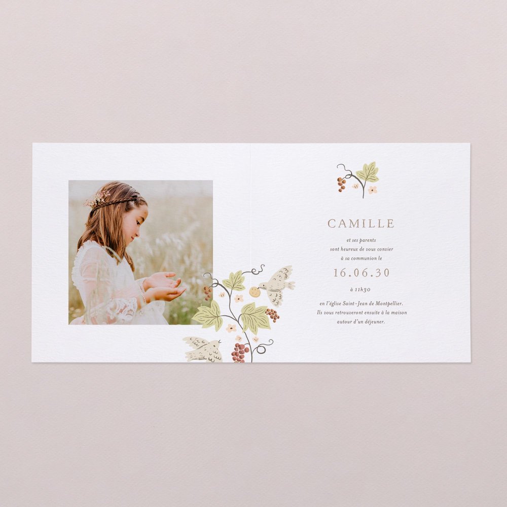Sur le faire-part personnalisable Petit Sarment, des colombes apportent l’heureuse nouvelle : la communion de votre enfant va être célébrée ! Illustrée avec tendresse et sublimée avec votre photo préférée, cette invitation charmera assurément vos invités.