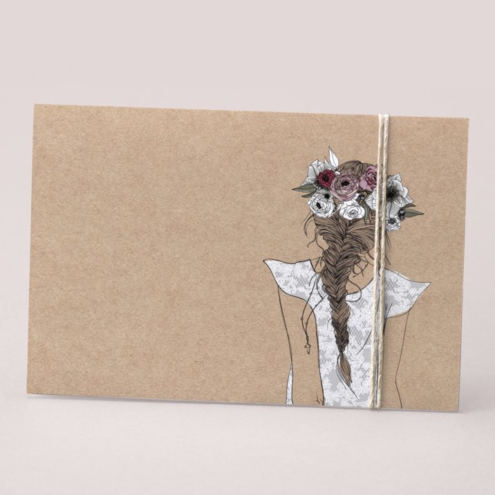 Ce faire-part se présente sous la forme d’un feuillet, se dépliant en 3 parties. Il se referme à l’aide d’une jolie étiquette personnalisable (incluse) et d’un ruban (au choix et en supplément).