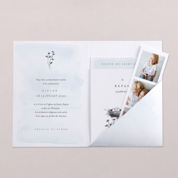 Ce modèle se présente sous la forme d’une pochette. Il comprend un faire-part, un photomaton et deux petites cartes à personnaliser comme vous le souhaitez : programme, invitation au repas…