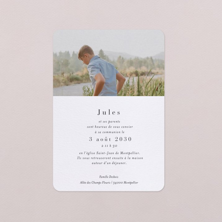 Entre tradition et modernité, le faire-part Abel conte la communion de votre enfant à tous ceux que vous aimez. Esquissés dans de tendres couleurs pastel, le petit garçon et son agneau symbolique, niché dans ses bras, refléteront avec charme cet événement unique.