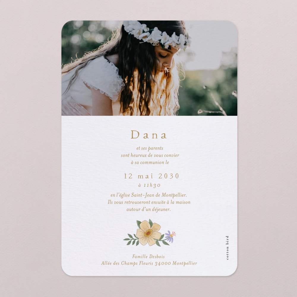 Une jolie couronne de fleurs encadre votre annonce de communion sur le faire-part Camomille. Sublimée d’un lettrage doré, cette fresque ensoleillée donnera le ton de la journée, dès l’ouverture du courrier.