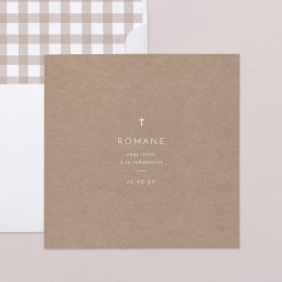 Sur un fond kraft élégant et sobre, le faire-part de communion Domitille est décoré d’une symbolique croix blanche, présageant la cérémonie à venir. Ce modèle vous permettra de personnaliser votre invitation avec la plus belle photo de votre enfant.