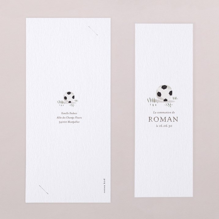 Le faire-part Ballon d’or dresse un doux portrait de communion de votre junior fan de foot. Tendrement illustrée et personnalisée à son image, cette création place votre garçon au centre de toutes les attentions.